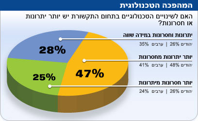 בעשור האחרון התקדמה הטכנולוגיה פלאים: האינטרנט מהיר יותר, הטלפון הנייד נישא בכיסנו כל הזמן וממדי הטלוויזיה והמחשב הצטמקו, והם כבר לא תופסים הרבה מקום. רוב העם קיבל את השינויים האלה בברכה, למעט כמה יוצאי דופן. מי שהביע "התנגדות" למהפכה הטכנולוגית, הם הציבור החרדי והדתי, ש-43 אחוזים מהם סברו כי יש לה יותר חסרונות מיתרונות. בקרב העולים מחבר המדינות, סבורים יותר כי במהפכה הטכנולוגית יש יתרונות, מאשר בקרב הישראלים הוותיקים (92% לעומת 42%).