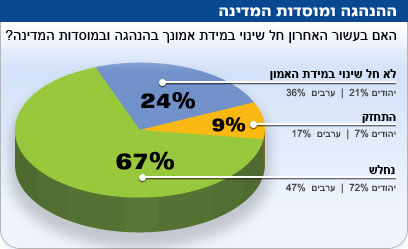 בתום עשור שבו התקיימו הכי הרבה מערכות בחירות לכנסת ולראשות הממשלה, ואחרי מצעד אינסופי של פוליטיקאים שנחקרו בחשד לשחיתויות, לא פלא שנחלשה מידת האמון בהנהגה ובמוסדות המדינה של רוב האוכלוסייה, 67 אחוזים מהנשאלים. רק 9% אמרו כי מידת האמון שלהם בהנהגה התחזקה, ו-24 אחוזים הודו כי לא חל שינוי במידת האמון שהם רוחשים כלפי המנהיגים ומוסדות המדינה. בקרב הצברים ובקרב הציבור החרדי והדתי, מידת האמון בהנהגה ובמוסדות המדינה נחלשה במיוחד. לעומת המגזר היהודי, שבו 7% טענו כי מידת האמון התחזקה, 17 אחוזים מערבים השיבו כי הם מאמינים יותר למנהיגים.