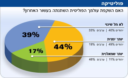 מהנשאלים שמיקמו את עצמם בצד הימני של המפה הפוליטית, טענו כי השקפת עולמם כיום ימנית יותר ורק 2% הודו כי הם נוטים יותר שמאלה. בקרב אנשי השמאל, 37 אחוזים טענו כי השקפת עולמם יותר שמאלנית, לעומת 14 אחוזים שסיפרו כי השקפת עולמם ימנית יותר. 16% מאנשי הימין אמרו כי לא חל שינוי בהשקפת עולמם הפוליטית, לעומת 49 אחוזים מאנשי השמאל שדבקים בעמדתם הפוליטית. תזוזה ימינה חזקה יחסית נרשמה בקרב הצעירים, הציבור החרדי והדתי, בקרב בעלי רמת הכנסה נמוכה ובקרב העולים.