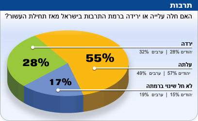 שסבורים כי הרמה התרבותית ירדה. 17% חושבים שלא חל שינוי ברמתה. חילונים, עולים מחבר מחבר המדינות, בעלי רמת השכלה אקדמאית ובעלי רמת הכנסה ממוצעת ומעלה סבורים שהקולנוע, הספרות, המוזיקה והתיאטרון השתפרו בעשור האחרון. 40% מהחרדים סבורים שרמת התרבות עלתה, לעומת 47 אחוזים שחושבים שהתרבות בישראל פחות טובה.