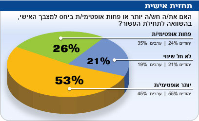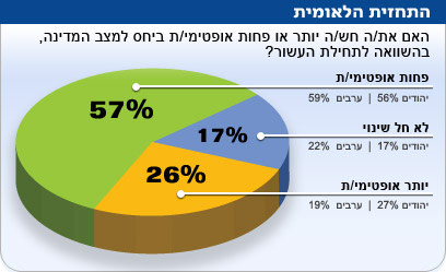 26% אמרו כי הם יותר אופטימיים, ובקרב 17 אחוזים לא חל שינוי בתחושה. רק בקרב העולים מחבר המדינות קיים פער לטובת "אופטימיים" ביחס למצבה של המדינה. תחושת הפסימיות מורגשת במיוחד בקרב גילאי 30-49, בקרב בני עדות מזרח, בקרב בעלי רמת הכנסה גבוהה ובעלי השקפת עולם הנוטה מרכז ושמאלה. פחות ערבים מיהודים השיבו כי הם יותר אופטימיים (19% לעומת 27%).