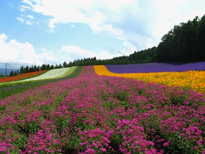 מרבדי פרחים בחוות טומיטה. הלבנדר הוא המפורסם ביותר