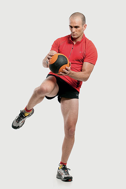 2. הבא את הכדור לכיוון החזה והרם את ברך ימין באלכסון לכיוון מרכז הגוף (הכדור יכול לגעת בזהירות בברך) וחזור לעמידת המוצא.
