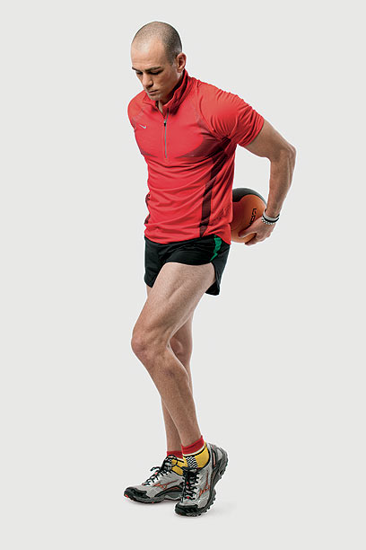 1. התחל בריצה קלה במקום ואחוז בכדור בשתי הידיים לפני הגוף.