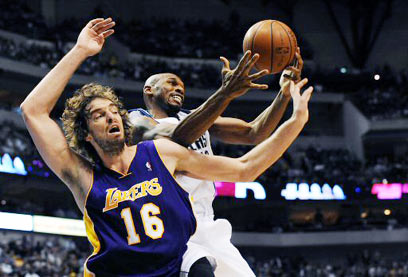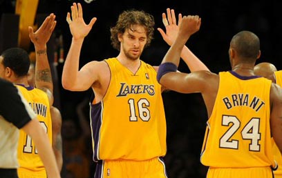 גאסול קורץ לבראיינט, שהתקשה למצוא את הסל לפנות בוקר (צילום: AFP)