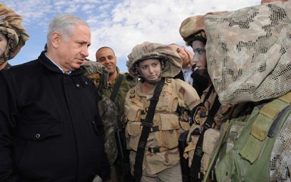 נתניהו עם חיילות מגדוד קרקל, במהלך הסיור (צילום: אבי אוחיון, לע"מ)