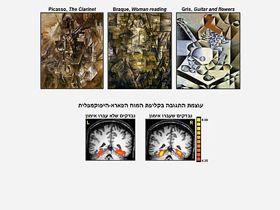 תמונה 2: השוואה בין הפעילות במוח בתגובה לציורים קוביסטיים בקבוצת נבדקי הביקורת לבין הפעילות במוחם של הנבדקים שעברו אימון קצר ולמדו כיצד לזהות תוכן מוכּר בציורים. פעילות חזקה יותר נצפתה בקליפת המוח הפארא-היפוקמפלית של הנבדקים שעבור אימון, כנראה כי השתמשו באסוציאציות רבות על מנת לבצע את המטלה.