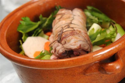 - שולים את הרולאד מהסיר ומצננים למשך לילה במקרר, שומרים את הירקות וגרגרי החומוס בכלי נפרד.