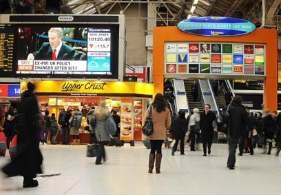 עדות בלייר מוקרנת על מסכים בתחנת רכבת בלונדון (צילום: AFP)