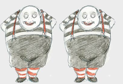 טווידלדי וטווידלדם, גרסת הבמאי (איור: טים ברטון). "אני מדמיין אותם כילדים ויקטוריאניים שובבים", אומר הקומיקאי הבריטי מאט לוקאס ("הממלכה הקטנה"), "ולכן גילמתי אותם בצורה ילדותית. זה בא לי טבעי, כי אני בעצמי ילד מגודל".