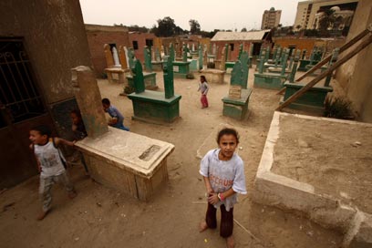 ילדים משחקים בין מצבות, כביסה תלויה ושלטי אזכרה ב"עיר המתים"