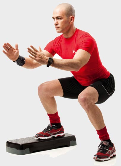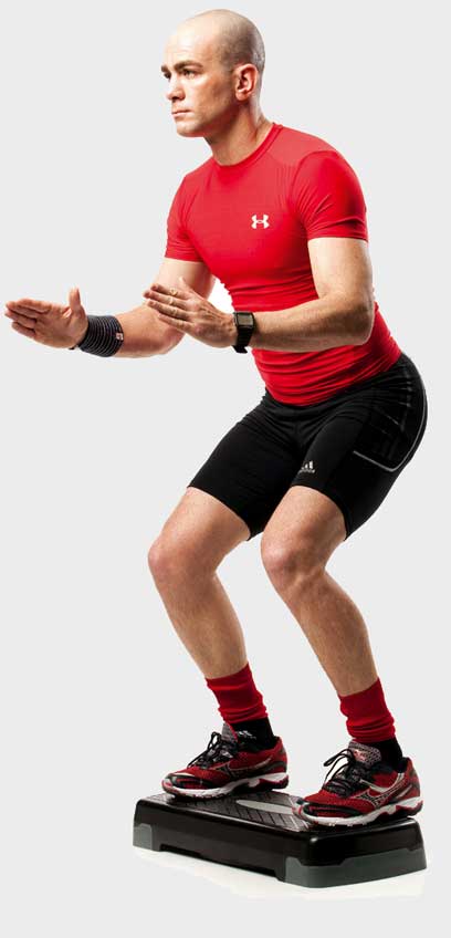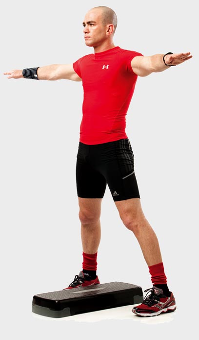 1. עמוד בעמידת פישוק כשהמדרגה במרחק נוח לפניך.