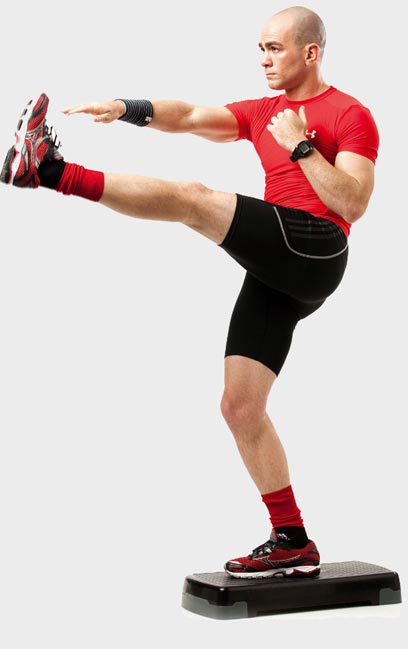 3. עלה שוב עם רגל ימין על המדרגה והרם את רגל שמאל לכיוון התקרה בבעיטה מוחזקת. יד ימין נוגעת בירך ואתה יוצר פיתול במותן. המשך כך גם עם רגל ימין. שמור על בטן אסופה, בייחוד כשהרגליים מורמות.