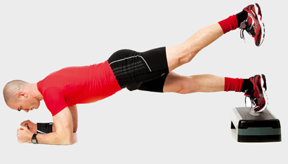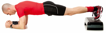1. רד לשכיבה על האמות כשכפות הרגליים מונחות על המדרגה. שמור על בטן אסופה וראש בהמשך לגוף.