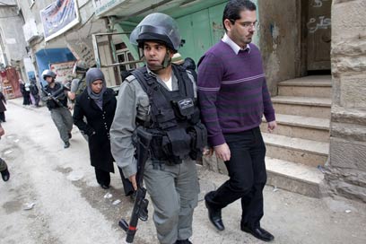 שוטר מג"ב מוביל עצור לניידת, היום במחנה הפליטים (צילום: AFP)
