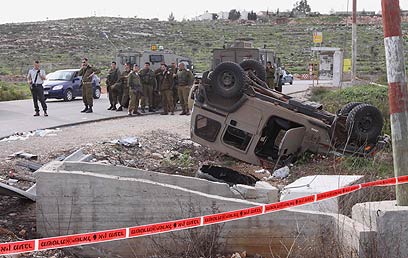 הג'יפ שבו נסע הנגד התהפך. המחבל כנראה פעל לבדו (צילום: עידו ארז)