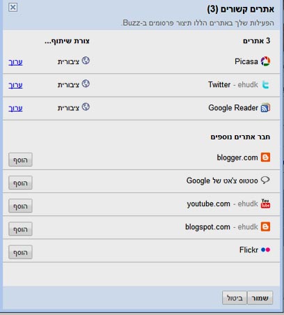 בנוסף, גוגל הכניסה את אלבומי התמונות של פיקסה, ואת טוויטר - פשוט מכניסים את השם שלנו שלנו. כך שאפשר, לצייץ ולזמזם (או לבזבז) בו זמנית מתוך הטוויטר, ולחלוק את הגיגנו עם כל העולם, פרט לחברינו בפייסבוק, שלא מתחבר לבאז.