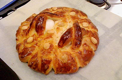 - מברישים בחלמון ביצה טרופה עם מים ומפזרים את השקדים למעלה (חשוב להצמיד אותם לבצק כדי שלא יפלו). אופים 30 דקות, עד שהחלות שחומות.