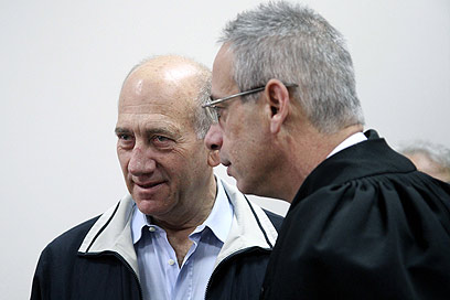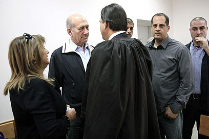 אולמרט בבית המשפט עם עו"ד נבות תל צור (צילום: אמיל סלמן)