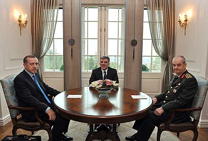 ראש ממשלת טורקיה, רג'פ טאיפ ארדואן, הנשיא, עבדאללה גול, ומפקד הצבא, אילקר בסבורג, נועדו היום (ה') באנקרה בניסיון להפיג את המתיחות בצמרת המשטר סביב מעצרם של עשרות קצינים בכירים בחשד לתכנון הפיכה. שר האוצר, עלי בבג'ן, הצהיר כי ניסיון ממשלתו להכפיף את הצבא למרותה רק נועד לחזק את הדמוקרטיה במדינה המוסלמית.