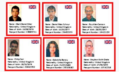 ששת בעלי הדרכונים הבריטיים הראשונים שנחשפו הם: סטיבן דניאל הודס, מלווין אדם מילדינר, ג'ונתן לואיס גרהאם, מייקל לורנס ברני, פול ג'ון קילי וג'יימס לאונרד קלארק. ששת בעלי הדרכונים הבריטיים שנחשפו השבוע הם: מארק דניאל סקלאר, רוי אלן קאנון, דניאל מארק שנור, פיליפ קאר, סטיב קית' דרייק וגבריאלה ברני.