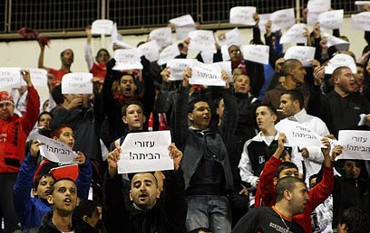 האוהדים ממשיכים במחאה נגד עזורי, גם מול נצרת (צילום: רועי עידן)