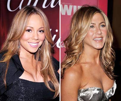 ג'ניפר אניסטון (מימין), מיישמת בהצלחה את ההסמקה בסגנון טבעי, ואילו מריה קארי הגזימה בניסיון ליצור מראה בובתי (צילומים: Gettyimages Imagebank)