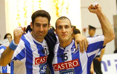 איציק חליפי וליעד אשכנזי חוגגים עוד עלייה לגמר הגביע (צילום: אלי אלגרט)