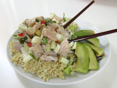 מגישים את הדג על מצע בורגול ופרוסות אבוקדו. להכנת הבורגול: משרים כוס בורגול בכוס מים כשעתיים. אם אין זמן אפשר להשרות במים רותחים ואפילו לחמם דקה במיקרו. לפני ההגשה, מוסיפים נתחים ממלפפון ללא הגרעינים ומתבלים במלח, מיץ לימון ושמן זית.