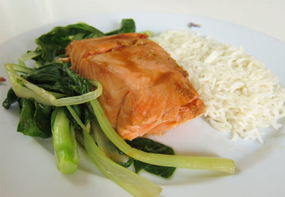 מומלץ להגיש בלוויית אורז בסמטי לבן ורוטב המורכב מ-3 כפות מחית מיסו לבנה, 2 כפות מים, 1 כף רוטב סויה ו-1 כף רוטב צ'ילי מתוק.
