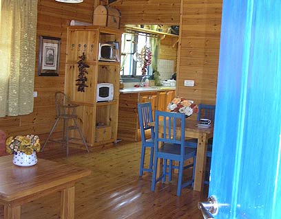 הבקתות זהות ובכל אחת סלון, חדר שינה זוגי וגלריית שינה לילדים, ובה מזרונים ושער עץ שאפשר לסגור ובכך למנוע ירידה בגרם המדרגות שלא לצורך. ליד הבקתות נמצא לול התרנגולות של המשפחה וקרקורים הם חלק בלתי נפרד מחוויית השהות במקום.