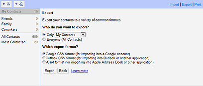 בעמוד שירות ספר הכתובות של גוגל תוכלו ללחוץ על קישור "ייצוא" ולקבל אפשרות לייצא את ספר הכתובות במגוון פורמטים המתאימים לתוכנות שונות לרבות אאוטלוק ויישום ספר הכתובות של מערכת ההפעלה של אפל.