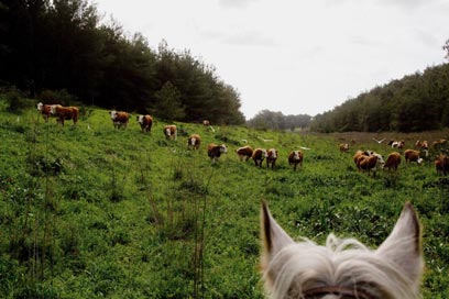 בניגוד גמור לאיך שזה הרגיש אצלנו בגוף, דובי דווקא היה די מבסוט מקצב ההתקדמות שלנו - המקצועית, וגם הגיאוגרפית - והחליט לסדר לנו טעימה קטנה של כינוס בקר בתור הכנה למשימה האמיתית שאליה יצאנו רק למחרת. העדר שעליו עשינו את הסטאז' היה כמה עשרות ראשי בקר מגזע סימנטל, שעליהם מפקד ביומיום רפתן מקיבוץ גלעד. המטרה היתה לאסוף אותם משטח המרעה אל המכלאה המרוחקת בסך הכל 300־400 מטר משם. לא עניין מסובך במיוחד, בטח בהתחשב בזה שהיינו מגובים בשני כלבי רועים חסרי סבלנות לפרות עם נטיות ארטיסטיות. הפרות מצידן ממש לא בקטע של להתווכח עם כלבים וסוסים: נכון שלפעמים הן מפרשות את ההתקרבות שלך לכיוונן כהנחיה לרוץ דווקא לכיוון ההפוך מזה שרצית, אבל זה רק בגלל שלא מדובר בדולפינים, אלא בבהמות לא מאוד מחוננות.