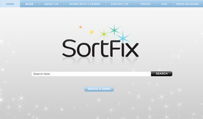 העמוד הראשי די סטנדרטי - ריק, עם שורת חיפוש, אבל בחברה לא מסתפקים ברקע לבן, אלא בעיצוב נוצץ וצבעוני. מקלידים את מחרוזת החיפוש ואז אפשר לראות את ההבדל. SortFix מציג תוצאות חיפוש מגוגל, מטוויטר ומבינג, ומעליהן ארבע תיבות.