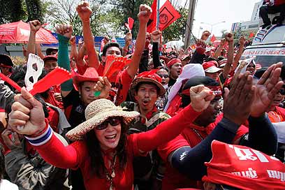 כמאה אלף מאנשי "החולצות האדומות" התומכים בראש הממשלה המודח, טקסין צ'ינאוואט, צעדו אל עבר הבסיס הצבאי בו שוהה ראש הממשלה המכהן, אבהיסיט ווג'אג'יבה, בדרישה שיפזר את הפרלמנט לאלתר. רה"מ סירב אך הותיר פתח למו"מ
