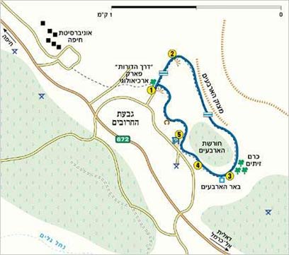 איך מגיעים: נוסעים בכביש 672 מחיפה לכיוון דרום-מזרח, לעבר עוספיא. כ-300 מטר אחרי כיכר הכניסה לאוניברסיטת חיפה פונים שמאלה (צפונה) עם שלט ל"חורשת ה-40". מיד פונים ימינה, ואחרי כ-350 מטר על הדרך פונים שמאלה לחניון קטן שליד עץ אורן גדול.