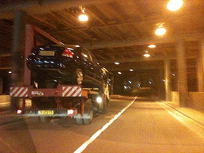 בין שמיים לארץ. הגרר ועליו המכונית נוסע ברחובות העיר (צילום: שימי לב)