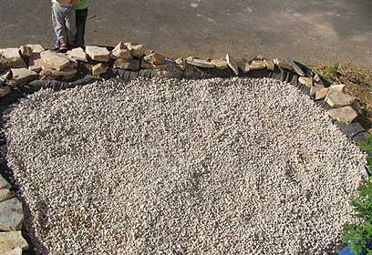 על גבי היריעה הנחנו שברי רעפים המהווים תחליף מצוין לחצץ בתור מצא בעל שטח פנים גדול. הרעפים לוקטו בשני אתרים בהם הסתיימה עבודת שיפוצים שם הם נותרו ללא דורש ועמדו להישלח למטמנה. ריסקנו את הרעפים לשברים בגדלים שונים, ככל שעולים בגובה המילוי של האגן. את השברים הקטנים שמנו בתחתית ומעליהם שברים גדולים קצת יותר. בשכבה העליונה של הבריכה פיזרנו חצץ בגודל בינוני (עדש ופוליה). לאחר מכן, קיפלנו את שולי היריעה והצנענו אותם בעזרת אבנים נאות כדי שכל האגן יקבל מראה נאה ואסתטי.