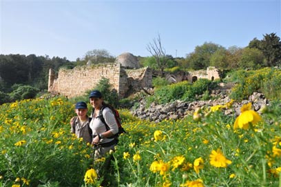 ים של חרציות מעניק לכיפות המבנה רקע מרהיב. שרידי הכפר נבי יושע