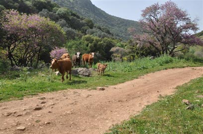 אחרי שהכריכים נבלעים ברעבתנות והרגליים זוכות למנוחה קצרה, אנחנו ממשיכים לשעוט בעקבות החבורה הגדולה שלנו. בתום ירידה חדה שמזכירה לי את מצב הברכיים הרעוע שלי, השביל שוב מתחיל לטפס בדרך כורכר רחבה, שלאורכה אנחנו פוגשים עדרי בקר השתולים בתוך גלויה אירופית ירוקה.
