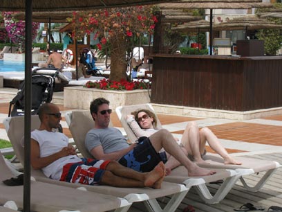 בדרום הארץ מצאנו את חברי "ארץ נהדרת" - אלי פיניש ועלמה זק (שהביאה איתה את אלון נוימן) משתזפים סביב הבריכה במלון מרידיאן. כיאה למעמדם הם העדיפו לכסות טפח ולהסתיר טפחיים. תפתחו מזגן, תמזגו לכם משהו קר - ותיהנו.