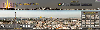 פנורמה צרפתית - נכון שאפשר לתפוס טיסה לפריז בכמה קליקים (ותמורת כמה מאות שקלים), אבל אפילו אם תגיעו לעיר האורות ספק אם תוכלו לראות אותה כך, כמו שמציע אתר Paris 26 Gigapixels המגניב. מדובר במראה פנורמי של העיר, שמורכב מ-2,346 צילומים ברזולוציה גבוהה במיוחד, ומאפשר לשוטט בעיר באופן וירטואלי באמצעות העכבר, לבצע זום ולהתמקד במבנים מסוימים או לקרוא על אתרים מפורסמים. בבלוג של הפרויקט אפשר למצוא הסברים וסרטונים על תהליך העבודה על האתר.