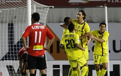 ברצלונה חוגגת את השער של איברהימוביץ' (רויטרס)