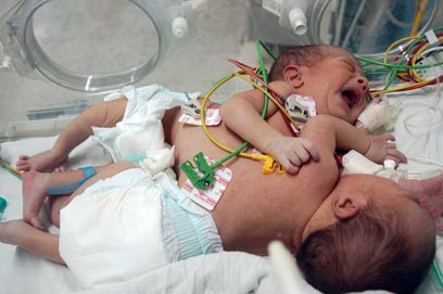היסטוריה ברשות הפלסטינית: לראשונה נולדו בעזה תאומות סיאמיות. התאומות, המחוברות בבטנן, נולדו אתמול (ד') בשעות הערב בבית החולים נאסר שבחאן יונס, בדרום רצועת עזה. התינוקות נולדו בניתוח קיסרי שנמשך כחצי שעה, ומשקלן בעת הלידה עמד על ארבעה ק"ג ביחד.