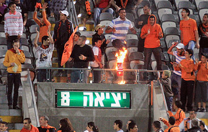 אוהדי בני יהודה שורפים צעיף של הפועל ת"א (צילום: אלי אלגרט)