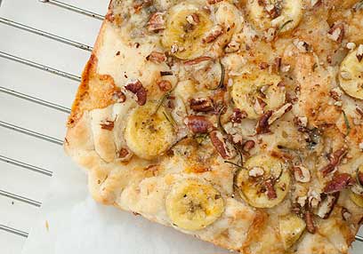 - מפזרים מעל הבצק את פרוסות הבננה, הגבינה המפוררת, פרוסות השום, אגוזי הפקאן והרוזמרין ואופים 20-25 דקות עד שהמאפה זהוב וריחני.