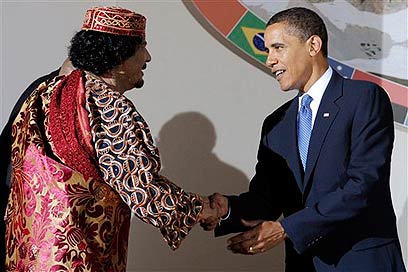 אובמה וקדאפי, אשתקד בוועידה באיטליה. "לא היה כמוהו" (צילום: AP)