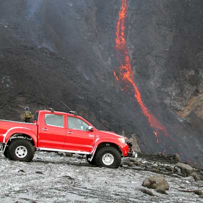 המדענים האיסנלדים, שנדרשו להציב ציוד ניטור קרוב להר הגעש מספר שעות לפני ההתפרצות הגדולה, אכן הגיעו לקרבת הלוע. רכבי ההיי לקס ששימשו את המשלחת, הוכנו על-ידי סדנה איסלנדית המתמחה בהכנת כלי רכב ארקטיים - אותה חברה שהכינה רכב דומה עבור מסע שערכו מגישי תכנית הטלוויזיה הפופולרית, טופ-גיר הבריטית.