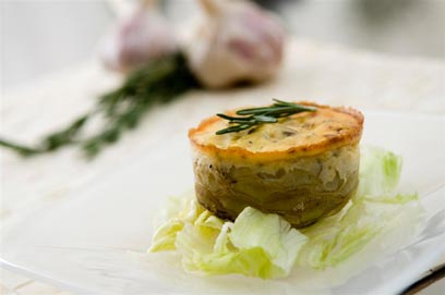 - בעזרת סכין מסירים פיסה קטנה מחלקה התחתון של כל תחתית ארטישוק כדי ליצור בסיס ישר. מניחים כל תחתית בשקע או בתבנית קטנה. יוצקים למעלה את המלית ואופים כ-30 דקות או עד שהמלית יציבה וזהובה. מוציאים מהתבניות ומגישים בעודן חמימות.