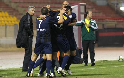 דובב גבאי חוגג עם החברים את שער היתרון של המלאבסים (רועי עידן)